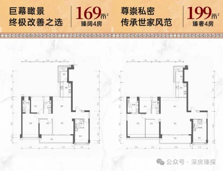 169㎡的4房2厅3卫,设计的是竖厅格局,2梯2户,专梯入户,独立入户玄关,客厅4.65米开间,LDKB一体化设计,四开间朝南,双主卧套间,分别做到了主卧18.98㎡/套间12㎡/次卧9.35㎡/次卧9.04㎡(包含墙体飘窗),客厅连接次卧出7.47米长的大阳台,看花园全貌景观,二字型厨房带1个生活阳台,公卫三段式分离,得房率68.58%(不含赠送),正南朝向。