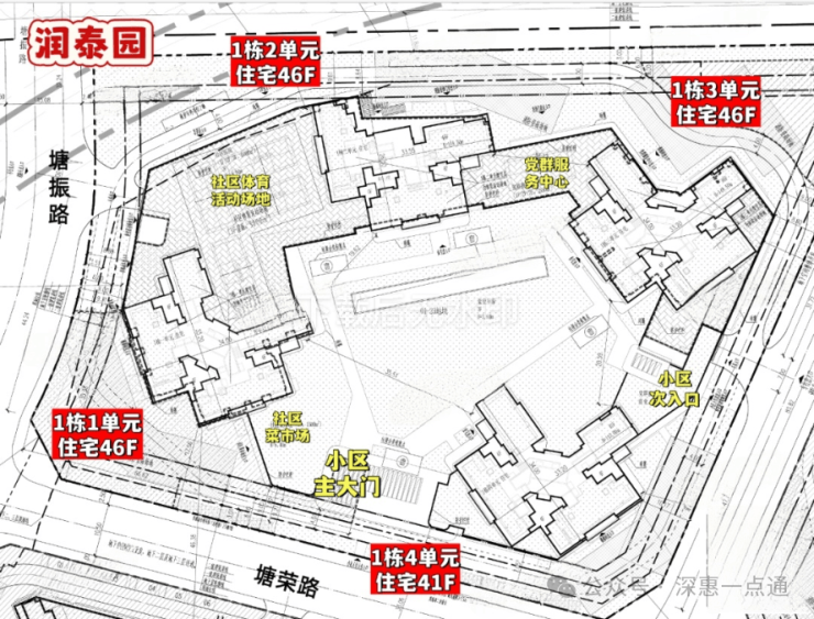 后面要入市的润泰园,总占地面积约1.4万㎡,总建筑面积约14.68万㎡,计容建筑面积约10.51万㎡,容积率6.74,绿化率40.01%,共由4栋总高41-46层高的住宅组成,其中1栋1/2/3单元住宅46层,1栋4单元住宅41F,配建有社区医院+菜市场。