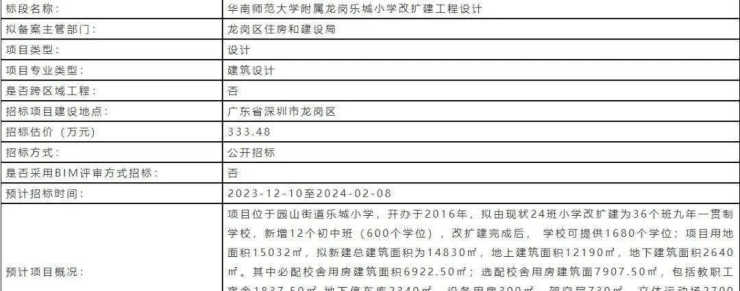 2024年1月一则政府通知,关于:华南师范大学附属乐城小学由现状24班小学改扩建为36班九年一贯制学校,新增12班初中,政府于2024年1月启动学校升级九年一贯制改扩建工程勘查招标计划。(数据来自网络新闻) 的消息一出,直接在龙岗家长群里炸开了锅,要知道这,这对区内基础教育的优质均衡发展可谓举足轻重。彻底弥补乐城小学“一站式基础教育”的遗憾。