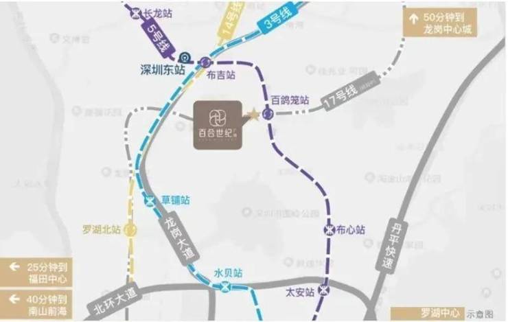 百合世纪广场项目有规划中的5/17号线百鸽笼站双地铁线上盖,1站可换乘3/14号线、4站可达福田、1站可达深圳东站、7站可达深圳北站,项目还临近主干道,离龙岗大道仅约1公里,离丹平快速仅约2.5公里,近距离连接北环大道、水官高速,快速通达全城各片区。