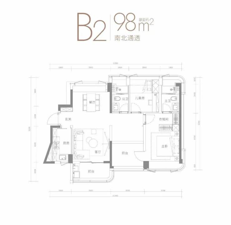 南北通透建面约98㎡户型