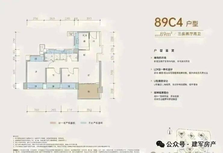 89㎡的3房2厅2卫,B户型,设计的是经典竖厅格局,进门入户玄关,客厅3.5米开间,LDKB一体化,动静分区,三开间朝南,S墙设计预留冰箱卡槽位,主卧+1个次卧270°飘窗,分别做到了主卧15.1㎡/次卧8.52㎡/次卧7.77㎡(包含墙体飘窗),U型厨房,卫生间干湿分离,得房率约:77.39%(不含赠送),西南朝向。赠送面积16.96㎡,加上赠送得房率96.84%。