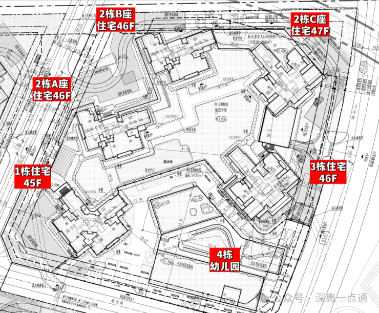 第一批入市的是润雅园,总占地面积约1.97万㎡,总建筑面积约17.69万㎡,计容建筑面积约13.11万㎡,容积率6.64,绿化率40.01%,共由5栋总高45-46层的住宅组成,其中1栋住宅45F,2栋A/B座住宅46F,2栋C座住宅47F,3栋住宅46F,4栋是1所幼儿园。