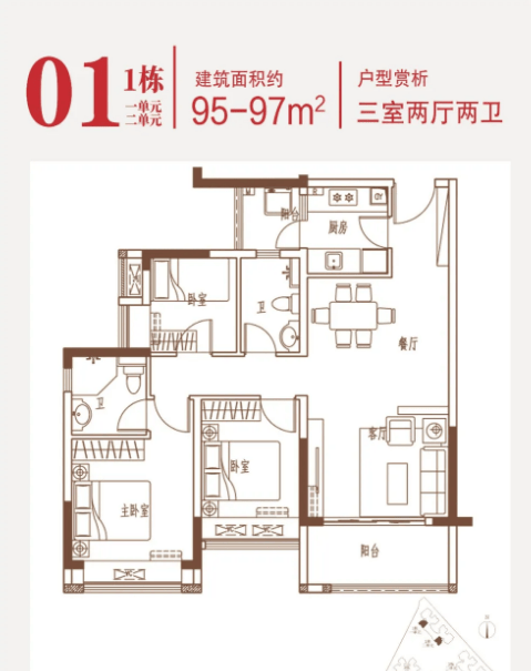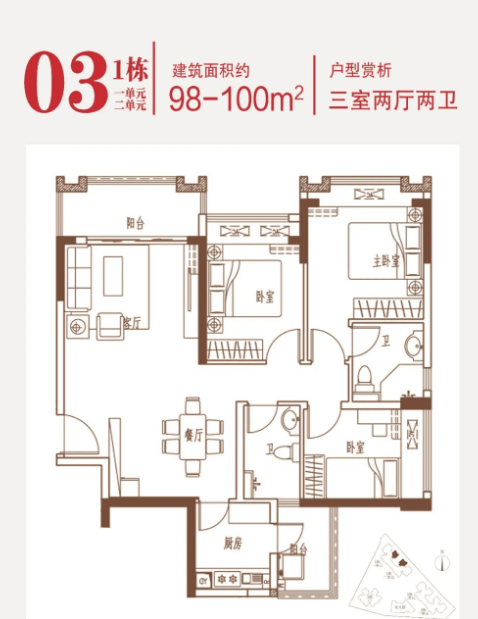 90-102㎡的3房2厅2卫户型。这几个户型都是在主人房多设计一个卫生间,私密性更强,也让家人间的生活更加方便。