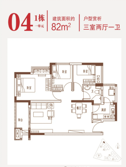 建面约82-83㎡的3房2厅1卫户型,在保证空间尺度感的前提下做到3个房间,实用性高,厅出阳台设计,厨房餐厅客厅衔接,面积更开阔的同时也做到动静分离,公共活动与私密生活互不干扰。一个细心的设计细节是,厨房旁边设计有生活阳台,可以晾衣服,储存清洁用具,保证景观阳台的干净整洁,让室内环境看起来更加井井有条。