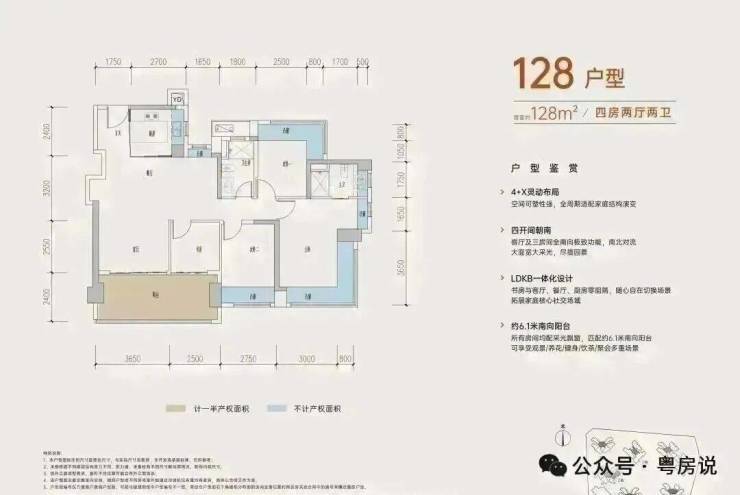 128㎡的4房2厅2卫,设计的是经典竖厅格局,进门入户玄关,客厅3.65米开间,四开间朝南,动静分区,主卧+1个次卧270度大飘窗,客厅连接次卧出6.15米长大阳台,4个卧室分别做到了主卧20.14㎡/次卧11.28㎡/次卧10.58㎡/次卧6.37㎡(包含墙体飘窗),得房率约:77.39%(不含赠送),东南朝向。赠送面积21.54㎡,加上赠送得房率94.45%。