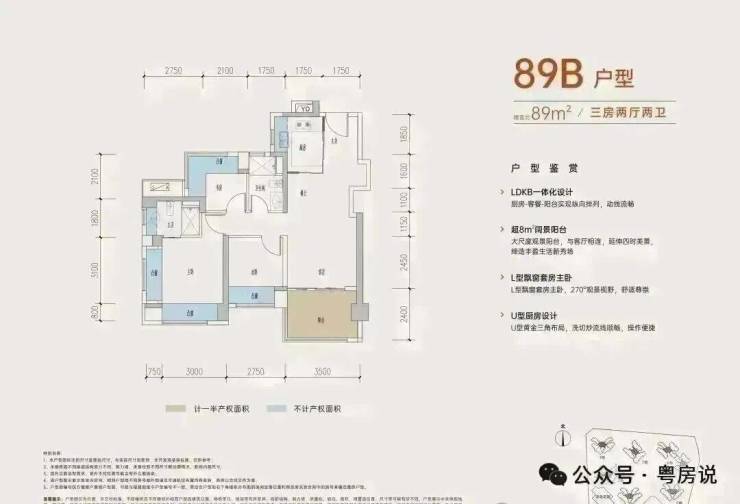 89㎡的3房2厅2卫,B户型,设计的是经典竖厅格局,进门入户玄关,客厅3.5米开间,三开间朝南,,主卧+1个次卧270°飘窗,3个卧室分别做到了主卧15.1㎡/次卧8.52㎡/次卧7.77㎡(包含墙体飘窗),得房率约:77.39%(不含赠送),西南朝向。赠送面积16.96㎡,加上赠送得房率96.84%。