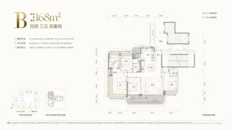 - 约168㎡ 四房三卫:双套间设计,8.2米阔景阳台,南北通透,兼顾采光与私密性,家庭居住舒适度拉满。