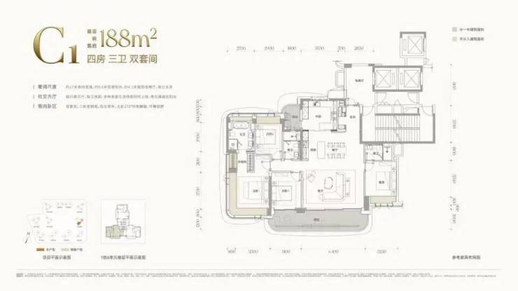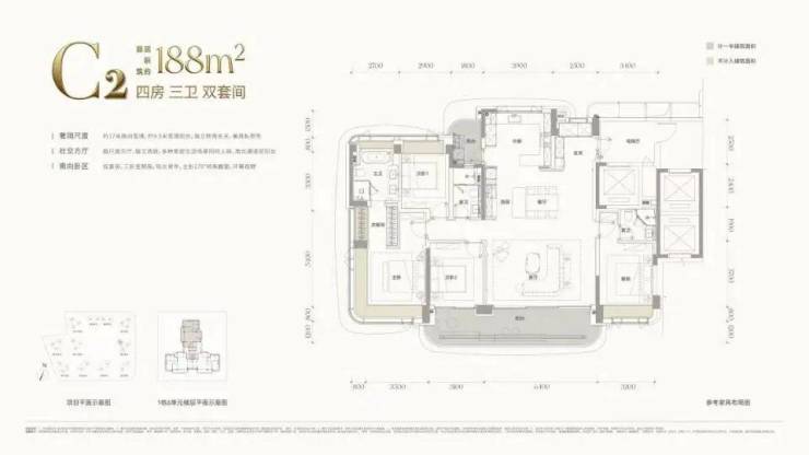 - 约188㎡ 四房三卫:9.5米巨幕阳台,独立私家门厅,可做4+1房,中西双厨布局,视野与功能兼顾,适合追求空间感的改善家庭。