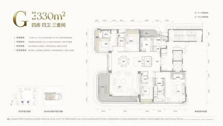 - 约330㎡ 大平层:尺度感进一步升级,客餐厅一体化布局,面宽更开阔,可灵活打造家庭专属的社交与休闲空间,多代同堂也能各有天地,适合追求极致居住尺度与私密性的改善家庭。