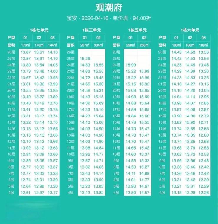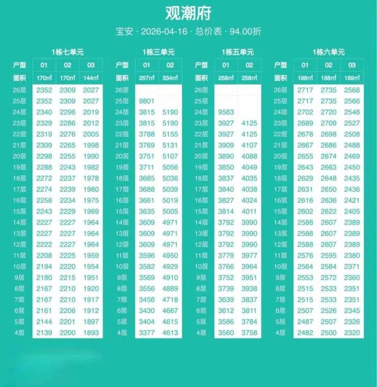 下图为完整官方备案价目表,包含各户型、各楼层备案单价及总价,大家可以直接参考,清晰了解项目价格区间。