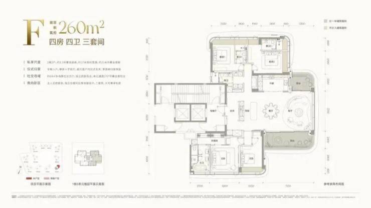 - 约260㎡ 四房四卫:2梯2户配置,270°环幕阳台,客厅全景视野,东南向海景体验佳,三套房设计,一步到位满足高阶改善需求。