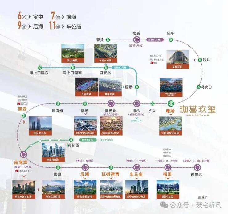 公共交通方面,「珈誉玖玺」位于综合体南侧,临近11号快线塘尾地铁站。