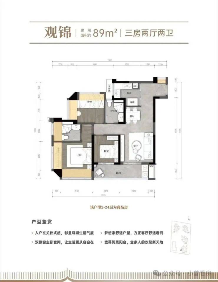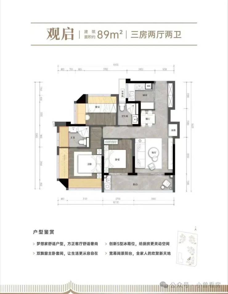 【建面约89㎡的三房两厅两卫】:竖厅格局,动静分区,厨房做的半开放式的,可开可合;景观双阳台连接次卧,还有一个次卧也是双飘窗;主卧带独立卫生间,空间也更大。