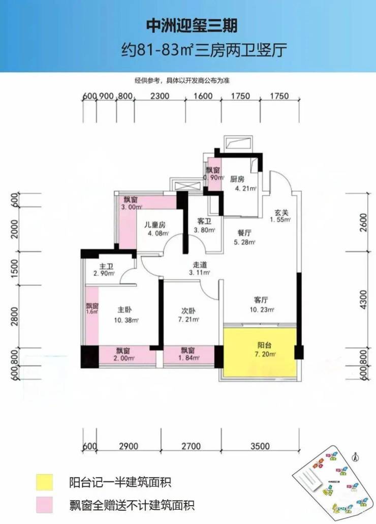 该户型为竖厅格局设计,主卧和儿童房均采用双飘窗设计,增加了室内空间的灵活性和舒适性,采光通风较好,且82㎡可以做到3个卧室、2个卫生间,这个使用率在市面上属于上乘。