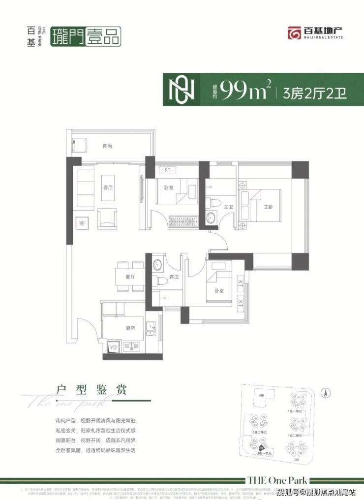 99㎡的3房2厅2卫,设计的是经典竖厅格局,进门入户玄关,客厅3.9米开间,LDKB一体化设计,动静分区,四开间朝南,主卧三面飘窗,U型厨房,卫生间干湿分离,得房率:71.29%(不含赠送),东南朝向。