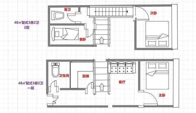 48㎡㎡3房2卫