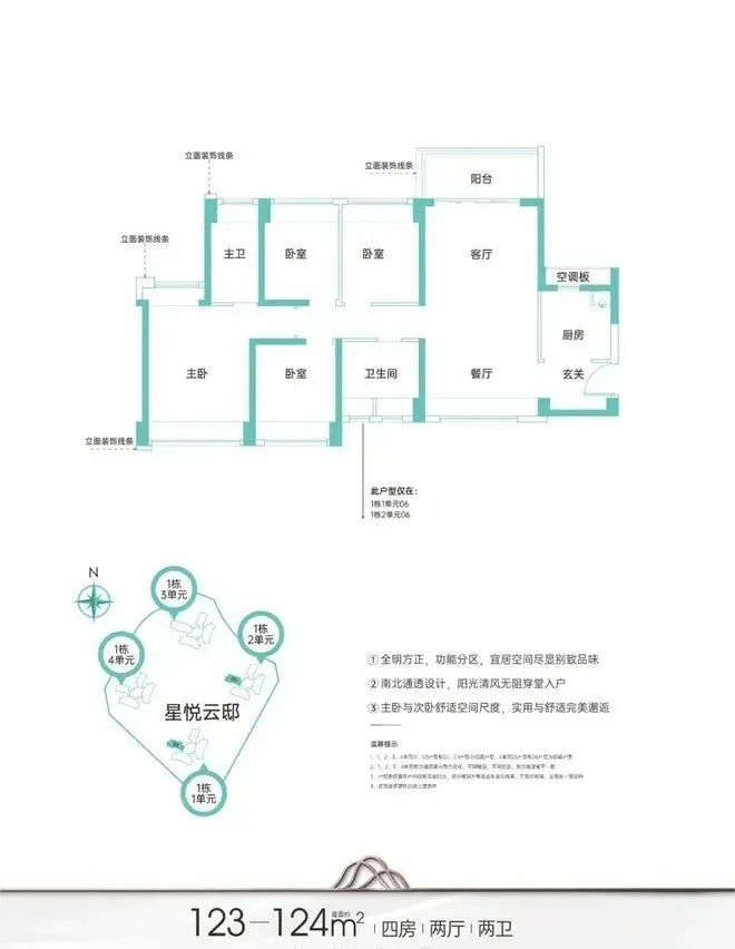 123-124㎡四房两厅两卫:竖厅南北通透格局,进门独立入户玄关,全屋飘窗设计,U型厨房。