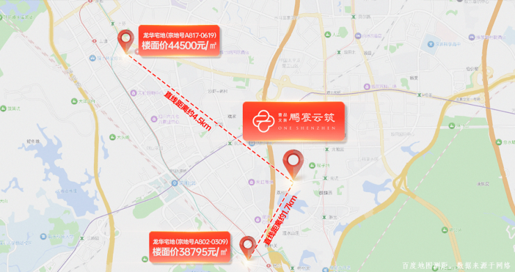 7月7日,民治街道梅林关A802-0309号宗地,吸引6家开发商参拍,经108轮竞价,以23.7亿元总价、38795元/㎡楼面价、40.74%的溢价率被拿下;6月19日,民治街道上塘A817-0619号宗地,吸引8家开发商参拍,经57轮竞价,以12.12亿元总价、44559元/㎡楼面价、46.6%的溢价被拿下,房企热抢 ,区域未来的价格充满想象。