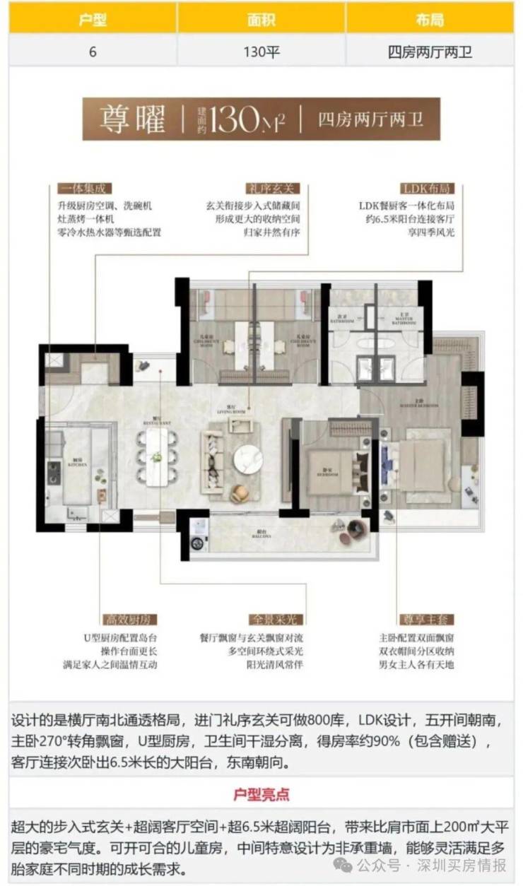 130㎡的4房2厅2卫,设计的是横厅南北通透格局,进门礼序玄关可做800库,LDK设计,五开间朝南,主卧270°转角飘窗,U型厨房,卫生间干湿分离,得房率约90%(包含赠送),客厅连接次卧出6.5米长的大阳台,东南朝向。