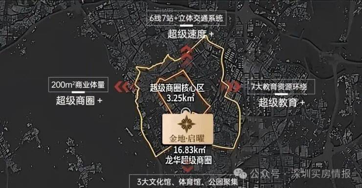 金地启曜府,位于深圳市龙华区民治街道工业路与人民路交汇处,处于龙华超级商圈核心区,已被纳入深圳都市核心区范围。这一区域在《深圳市国土空间总体规划(2021-2035年)》中获得"双中心"战略定位,即南部民治、龙华街道为都市核心区,北部规划为新一代城市中心,形成南北双轮驱动的发展格局。项目所在的龙华商业中心旧改总建面超200万㎡,涵盖住宅、商业、教育及交通配套,预计2028年全面建成后将形成集商业商务、文化时尚、休闲娱乐、高端居住于一体的深圳最具都市活力区域之一。