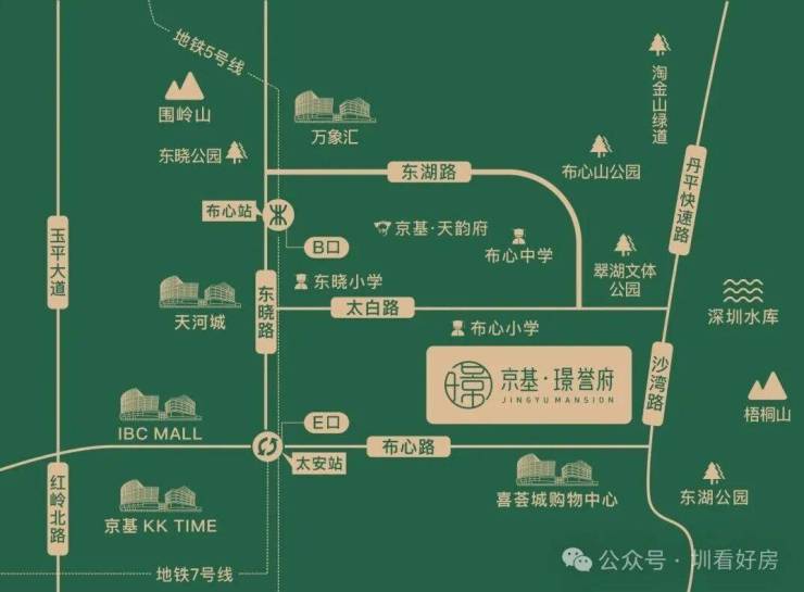 京基璟誉府的交通配套极为便利。项目毗邻东湖路、太白路、东晓路等城市主干道,0距离丹平快速,快速接驳坂银通道、清平高速、东部过境高速,让您瞬达全城。15分钟车程可覆盖罗湖、文锦渡口岸,30分钟车程可达莲塘口岸,高效通行深港,畅享双城生活。此外,深圳站和罗湖北站(在建中,计划2028年通车运营)两大高铁站近在咫尺,地铁5号线布心站和5/7号线太安站也在步行距离内,快速换乘1/2/9号线,让您轻松畅达湾区。