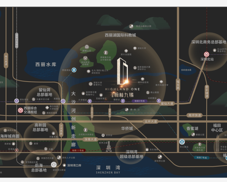 留仙大道正席,紧邻地铁5号线塘朗站,4/5/7号线3轨环绕,毗邻“三纵五横”主干道,瞬息通达全城。西丽高铁站(建设中)、深圳北站两大枢纽环绕,拥有世界交通能级。