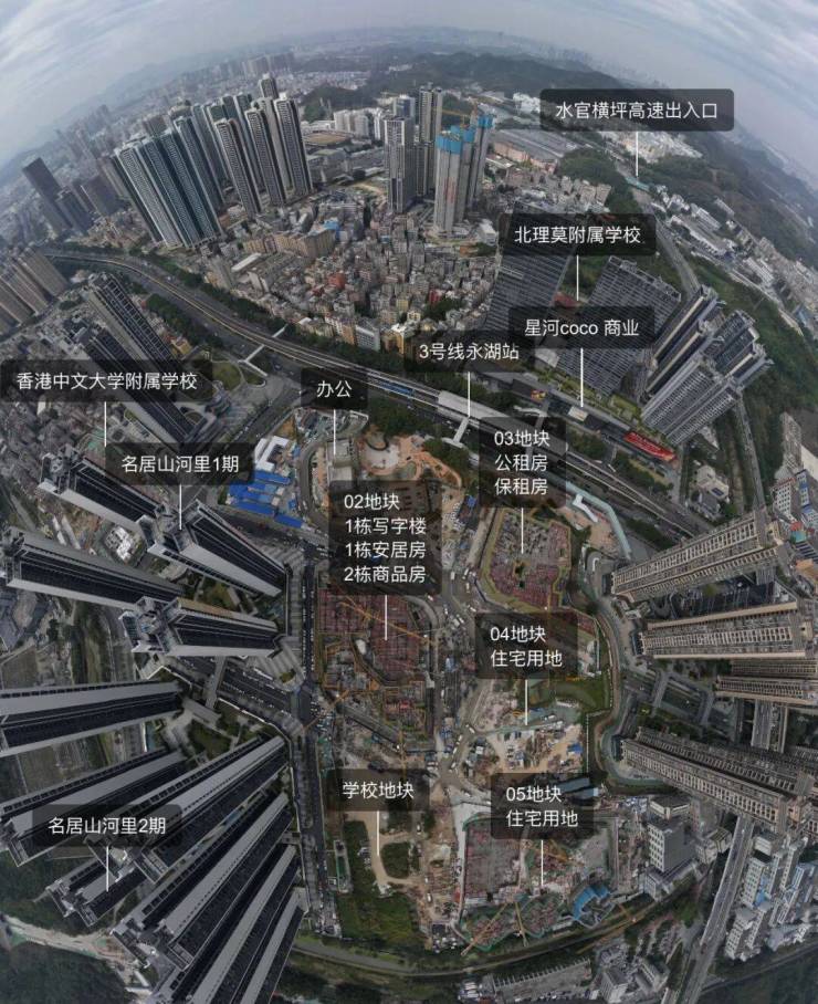 这几个地块在后期都会有风雨连廊连接在一起,直接接驳到地铁站,红色地块的是1所九年制公办学校,目前还是一片空地,没有公布出来具体学校。
