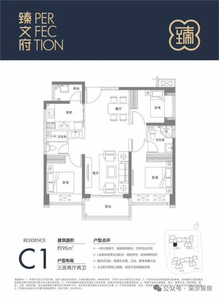 95㎡的3房2厅2卫,设计的是竖厅双龙抱珠格局,一体化客餐厅,三开间朝南,L型厨房还带1个小生活阳台,公卫三段式分离设计,阳台朝东南向。