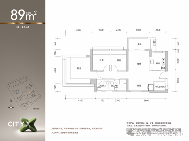 王炸户型 约89㎡3+1房两厅两卫(双娃家庭置业首选)