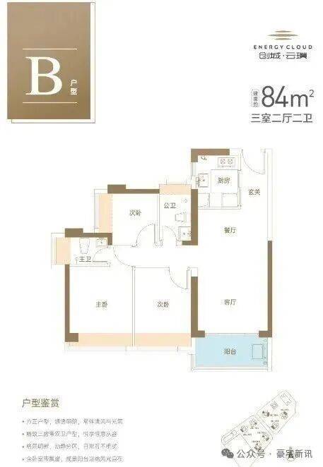 84㎡的3房2厅2卫,设计的是竖厅格局,进门入户玄关,客厅3.4米开间,LDKB一体化设计,动静分区,3个卧室分别做到了主卧10.45㎡/次卧8.76㎡/次卧5.39㎡(实测面积,去掉墙体),U型厨房,卫生间干湿分离,得房率约74.4%(不含赠送),套内面积62.4m²,西北、东北、东南或西南朝向。