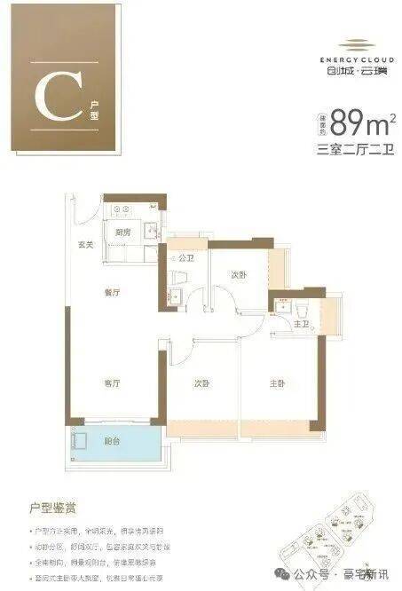 89㎡的3房2厅2卫,设计的是经典竖厅格局,进门入户玄关,客厅3.5米开间,LDKB一体化设计,三开间朝南,动静分区,3个卧室分别做到了主卧11.23㎡/次卧9.1㎡/次卧5.64㎡(实测面积,去掉墙体),U型厨房,卫生间干湿分离,得房率约73.29-73.86%(不含赠送),西南或东南朝向。