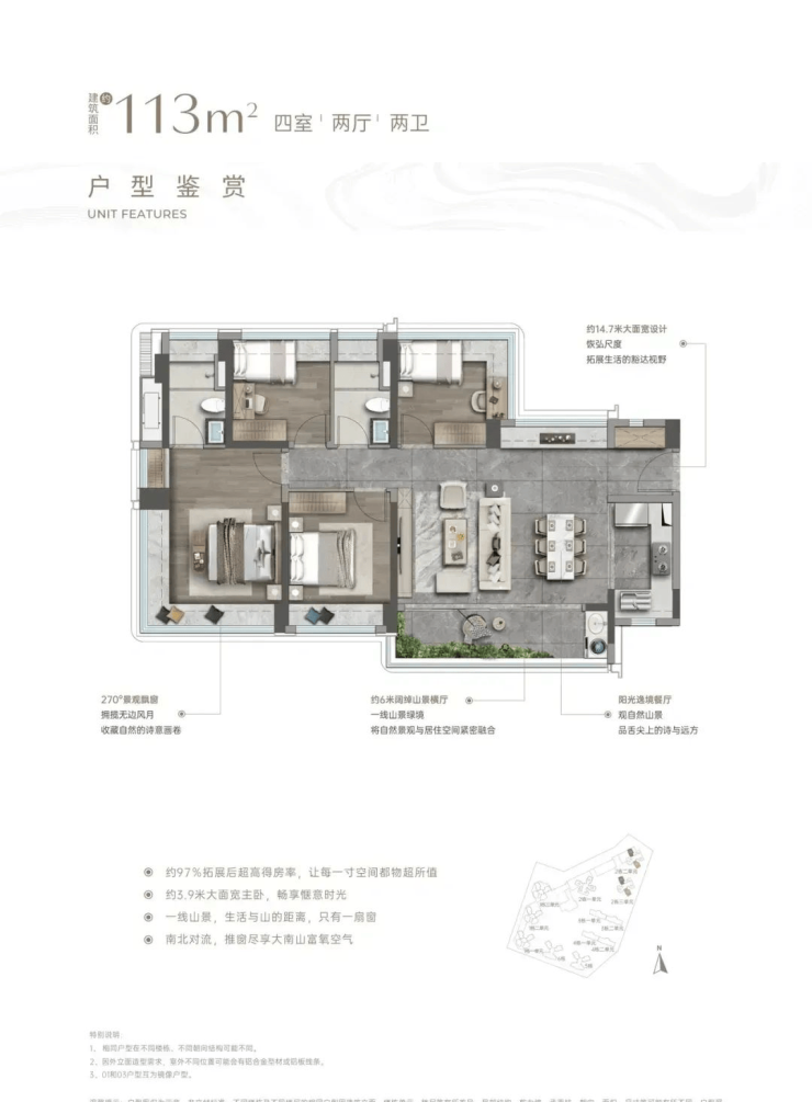 115㎡4房2卫:横厅南北通透格局,客餐厅6米开间,全屋飘窗,4个卧室分别做到了3.9米/3米/2.8米/2.6米的宽度,L型厨房,得房率约95-97%(包含赠送),东南或西南朝向以及西北朝向,有3种户型格局,但整体差异并不大,都是横厅设计,阳台同样非常宽敞。主要核心区别是阳台的设计,这应该是为了贴合楼栋朝向、景观所做的调整。