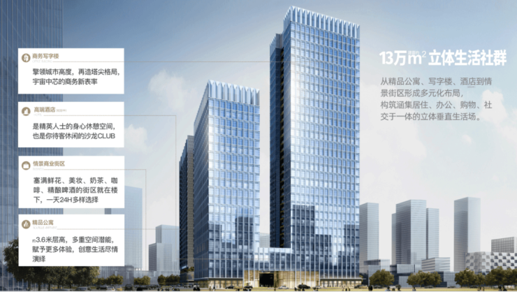打造多元化生活场,集精品商务公寓、写字楼、酒店、情景街区形成多元化布局,构建涵集居住、办公、社区于一体的城市立体垂直场。