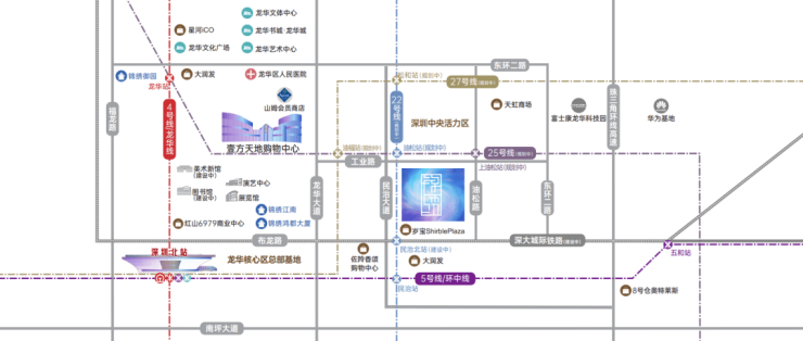 4/5/6/10号线已通车,22/25/27号线(规划中)交汇于龙华油松片区,畅达深圳北站、福田CBD、后海中心区