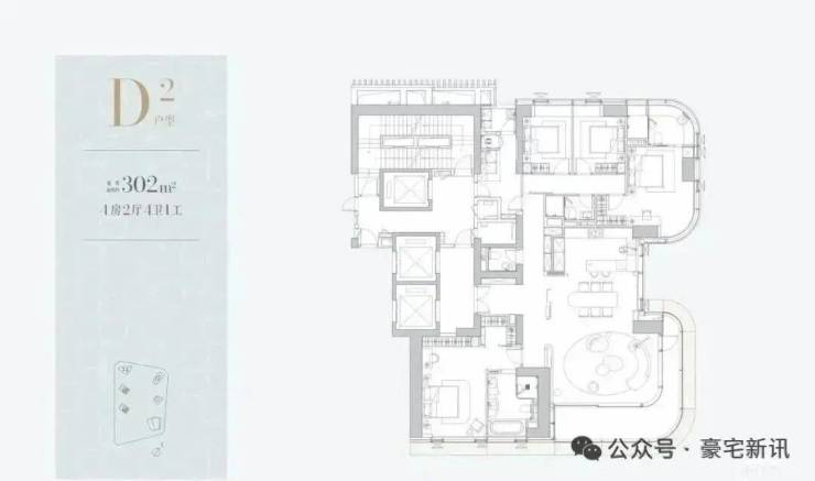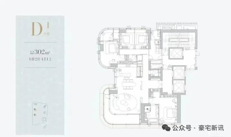 1D栋(1栋四单元)-45层:均为3梯2户,约302㎡,一层两户。