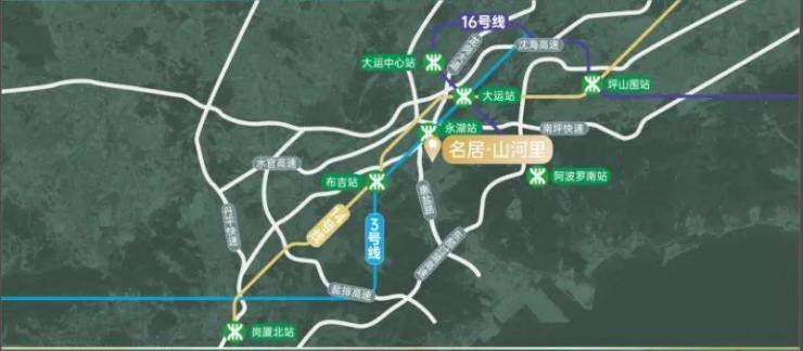 『多维路网』 立体交通触达世界立体交通构建高效湾区生活圈,赋予先于世界的出行权。l “三地铁”自由出行3号线:约200m即永湖地铁口,两站到大运,8站到罗湖14号线:两站达大运,7站抵达布吉,10站即达岗厦北16号线:一站达大运中心,速联园山街道,抵达阿波罗未来产业园l “三横五纵”多维路网三横:水官高速、南坪快速、沈海高速五纵:龙岗大道、丹平快速、盐排高速、惠盐路(部分已建成)、东部过境高速(在建中)