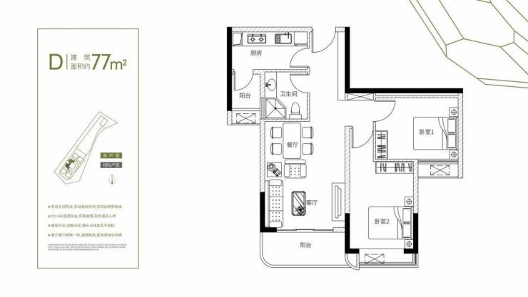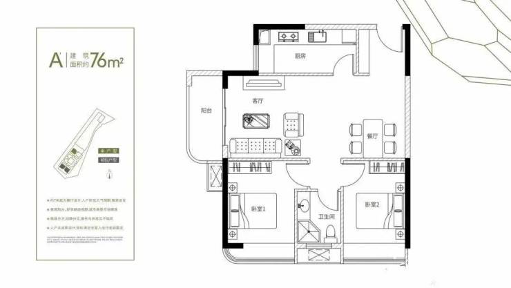 建筑面积约76-78㎡2房+1卫(灵活多变+1多功能空间)