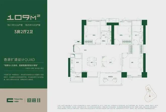 三房,西南朝向,可看海景(有中洲湾一期的遮挡),传统横厅设计,厨房和餐厅有遮挡