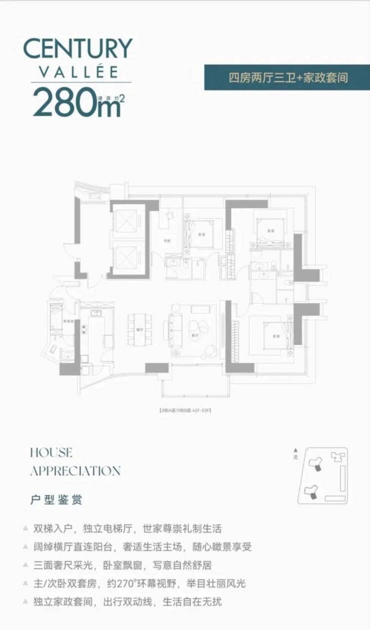 【约386㎡4房3卫】双梯入户,独立电梯厅,阔绰横厅直连多功能空间,三面舒适采光,主次卧双套房,270°环幕视野,还有独立家政套间,西朝向看名商高尔夫和大河沙生态长廊。