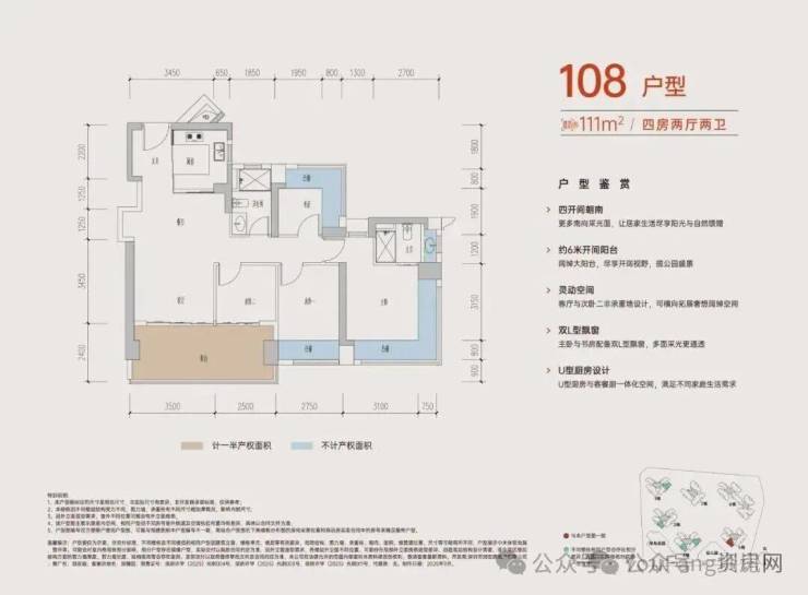 竖厅设计动静分区,约3.5米开间主卧,带独立卫生间,书房L型飘窗,多面采光更通透,U型厨房布局,流线顺畅。