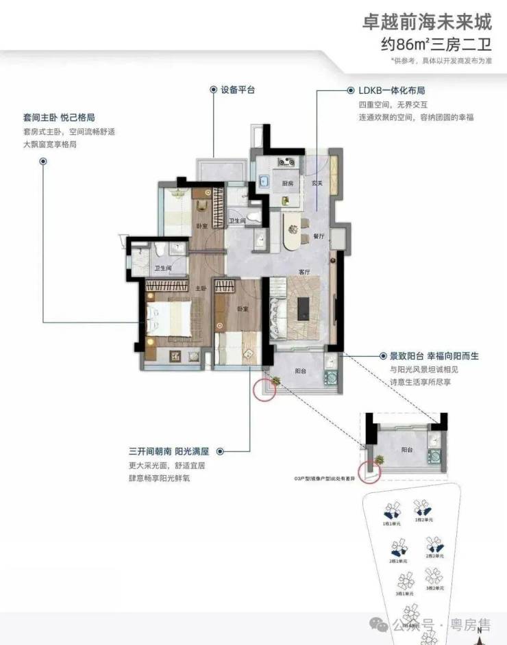 86㎡的3房2厅2卫,设计的是竖厅格局, 进门入户玄关,客厅3.2米开间,LDKB一体化,S墙设计预留冰箱位,三开间朝南,3个卧室分别做到了3米/2.4米/2.4米的宽度,U型厨房,公卫三段式分离,还带1个设备平台可以使用,得房率约:89%(包含赠送),阳台有东南或西南朝向