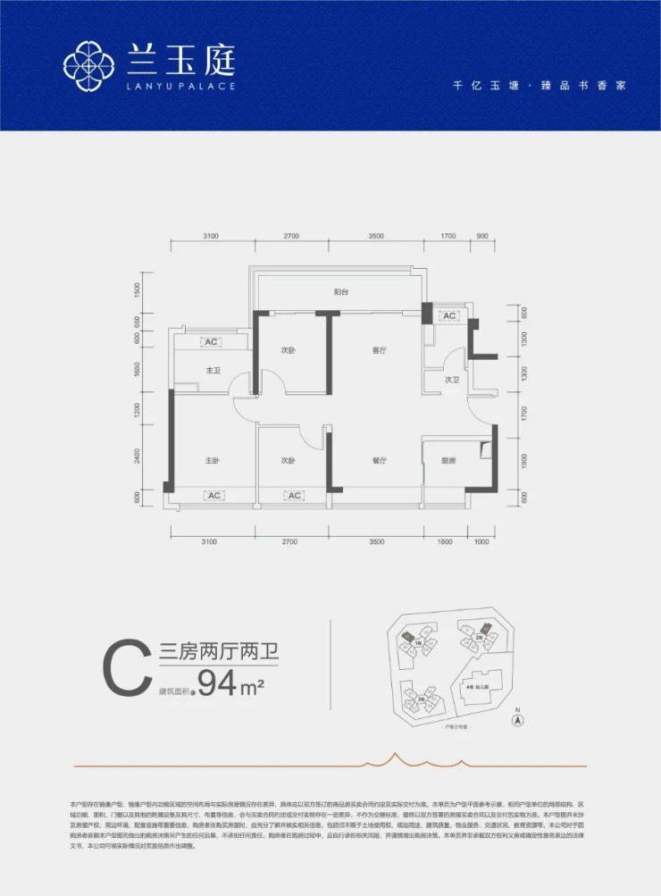 94㎡的3房2厅2卫,C户型,设计的是竖厅南北通透格局,客厅开间3.5米,3个卧室分别做到了3.1米/2.7米/2.7米的宽度,客厅连接次卧出6.2米长的大阳台,U型厨房,公卫三段式分离,得房率约79%(不含赠送),阳台主朝西北或东北向。
