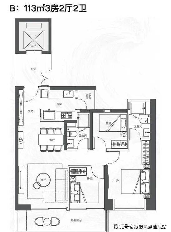 113㎡三房:总价737万起,套内使用率72%,西南朝向+6.5米观景阳台,次卧面宽2.7米需改造;