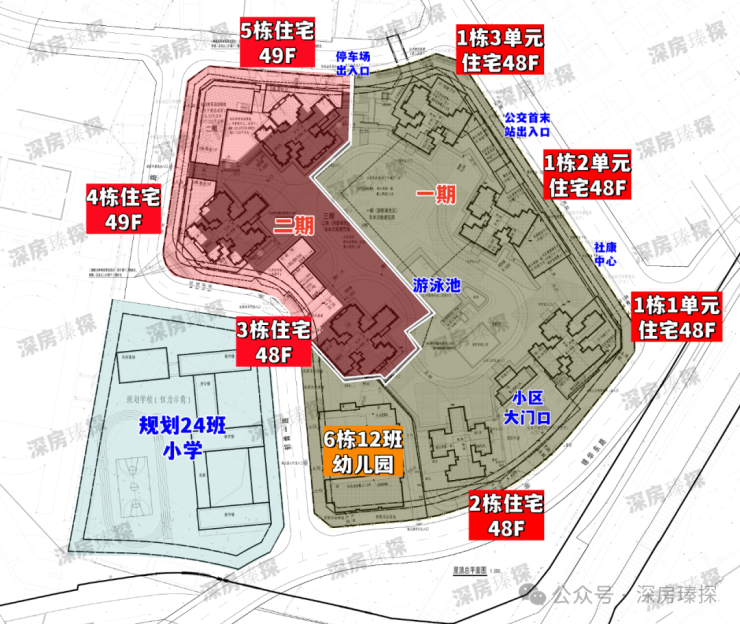 卓越珺奕府,总占地面积约3.26万㎡,总建筑面积约31.4万㎡,其中计容建筑面积约22万㎡,容积率6.75,绿化率40.13%,分2期开发,共由7栋48-49层高住宅组成,其中1栋1/2/3单元住宅48F,2栋住宅48F,3/4/5栋住宅49F,6栋是1所12班制幼儿园,小区也是配建有游泳池。