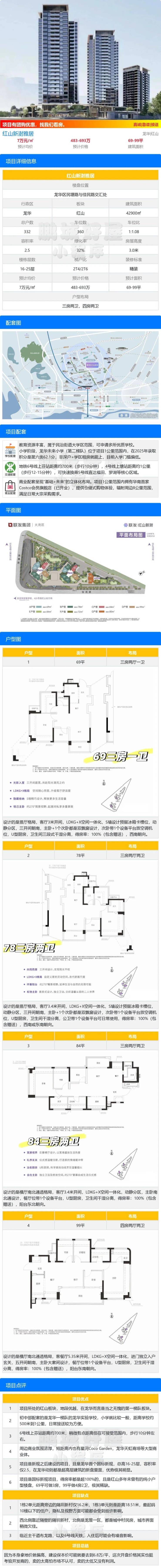 龙华区红山板块【红山新澍雅居】计划2026年1季度取证入市,面积有69平的2+1房1卫,78-84平的3房2卫,99平的4房2卫户型,共332套房源,户户朝南,总高16-25层。