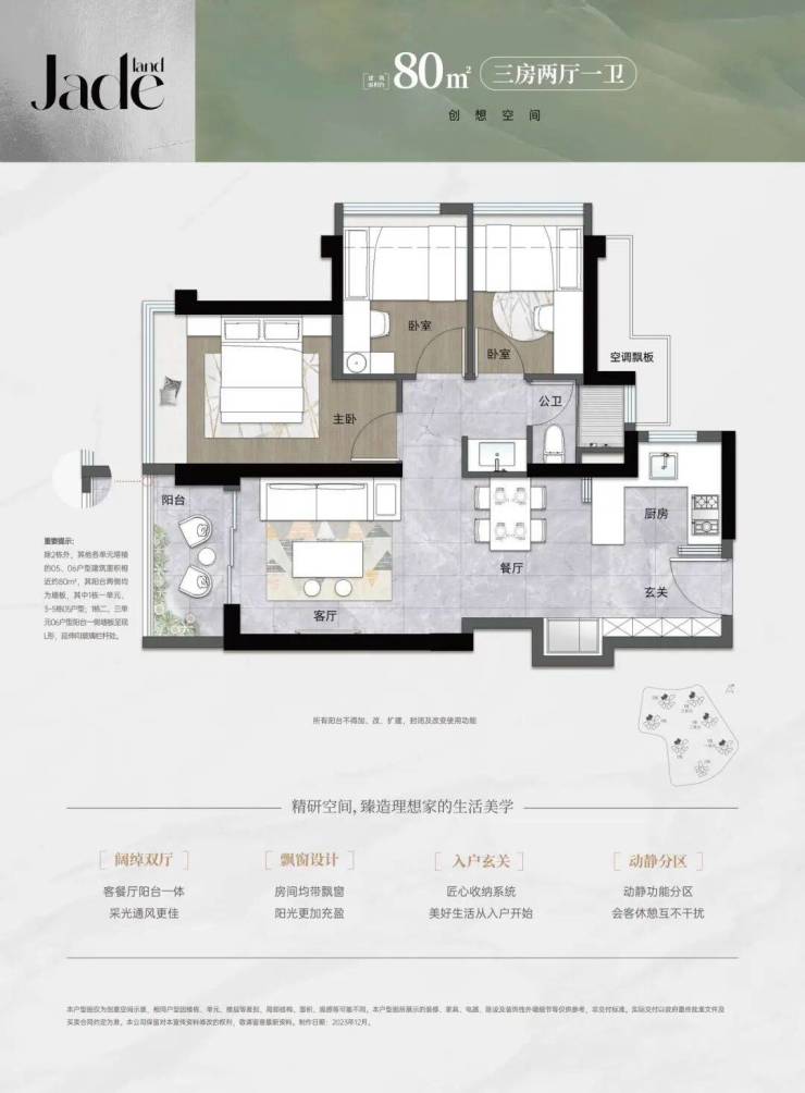 80㎡三房两厅一卫:此户型布局方正,空间利用率高,非常适合小家庭或年轻夫妇。清晰的起居空间与卧室区域划分,满足您家庭的日常需求。