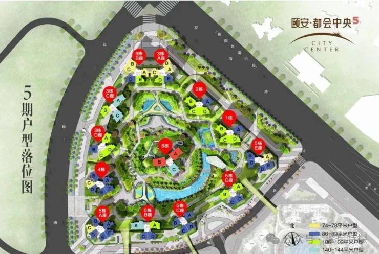 颐安都会中央5期,总占地面积4.9万㎡,总建筑面积约23.89万㎡,容积率3.5,绿化率32%,共由6栋13座住宅组成,总高28-30层,其中本次推出的5栋A/B座住宅30F,总规划1643户,车位占比1:1.05。5栋A座3梯6户,5栋B座2梯4户设计,层高3米