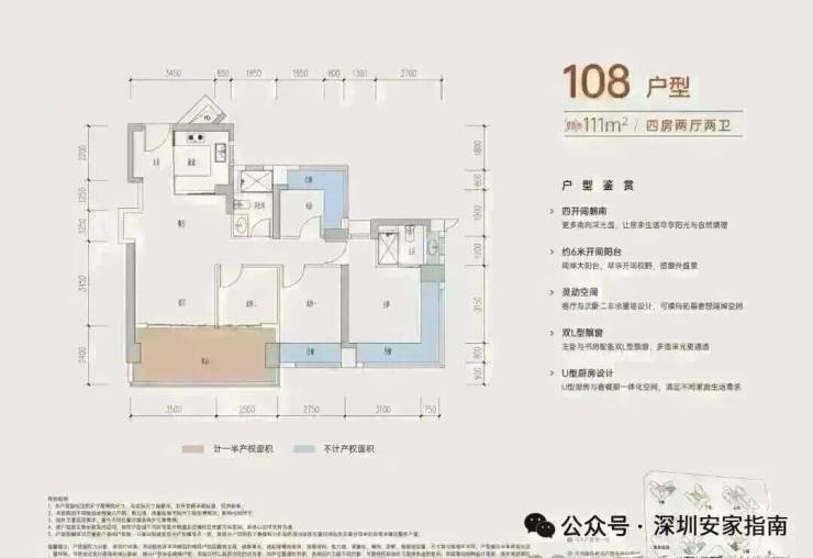 108-110㎡的4房2厅2卫,A户型,设计的是经典竖厅格局,进门入户玄关,客厅3.45米开间,LDKB一体化,S墙设计预留冰箱卡槽位,四开间朝南,动静分区,主卧+1个次卧270度大飘窗,客厅连接次卧出6米长大阳台,分别做到了主卧16.4㎡/次卧11.2㎡/次卧7.84㎡/次卧6.25㎡(包含墙体飘窗),U型厨房,卫生间干湿分离,得房率约:77.3-77.39%(不含赠送),西南朝向。赠送面积18.4㎡,加上赠送得房率94.04%。