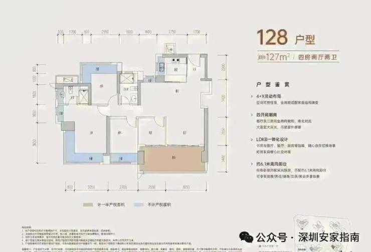 126-128㎡的4房2厅2卫,设计的是经典竖厅格局,进门入户玄关,客厅3.65米开间,LDKB一体化,S墙设计预留冰箱卡槽位,四开间朝南,动静分区,主卧+1个次卧270度大飘窗,客厅连接次卧出6.15米长大阳台,分别做到了主卧20.14㎡/次卧11.28㎡/次卧10.58㎡/次卧6.37㎡(包含墙体飘窗),U型厨房,卫生间干湿分离,得房率约:77.3-77.39%(不含赠送),东南朝向。赠送面积21.54㎡,加上赠送得房率94.45%。